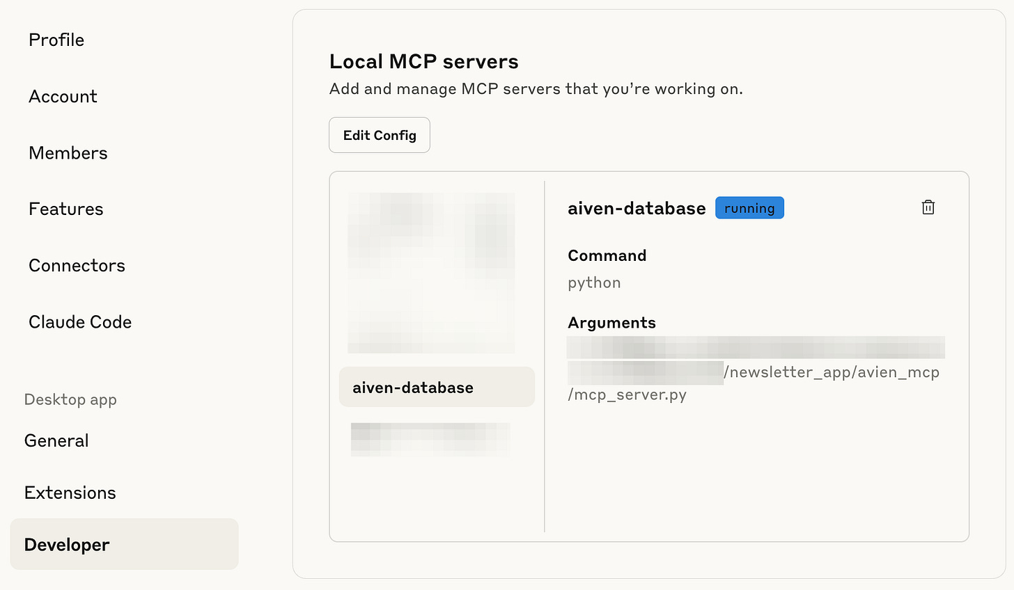 With an MCP library to wrap the scaffolding and a quick installer script, I had the whole thing running. In Claude Desktop’s Settings / Developer tab, it appeared as aiven-database (please excuse this totally random name).