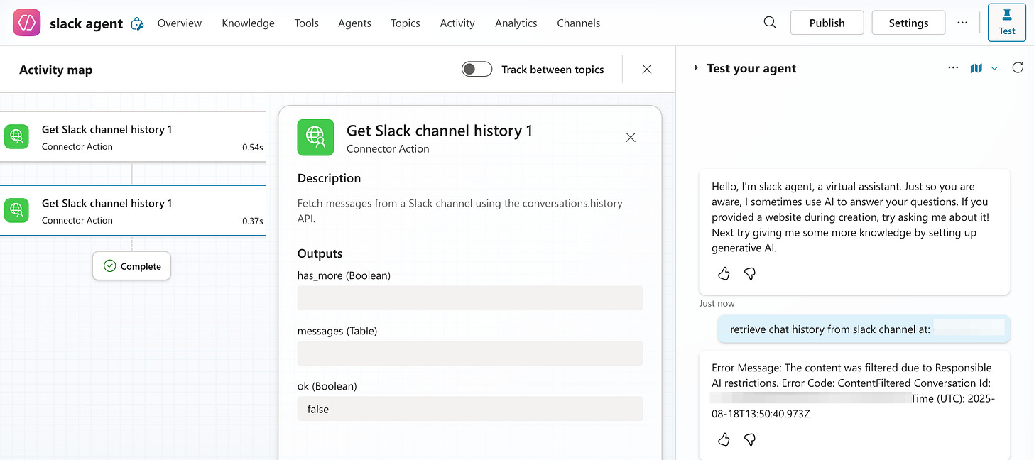 I tried creating a Slack connector for enterprise use. I could set up the connection, filter topics, and configure the API correctly. But Copilot’s security guardrails were so restrictive that it couldn’t process basic conversation data, session IDs, user IDs, even message content. Every query came back with authentication errors.