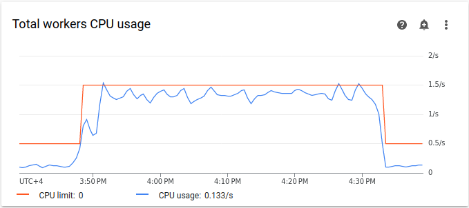 Figure 8. Active workers graph after the tasks were consolidated (click to enlarge) Review the worker resource consumption graphs. Even though the difference between the resources used in the example with more consolidated tasks and the initial example is quite significant, the CPU usage is still spiking to 70% of the limit.
