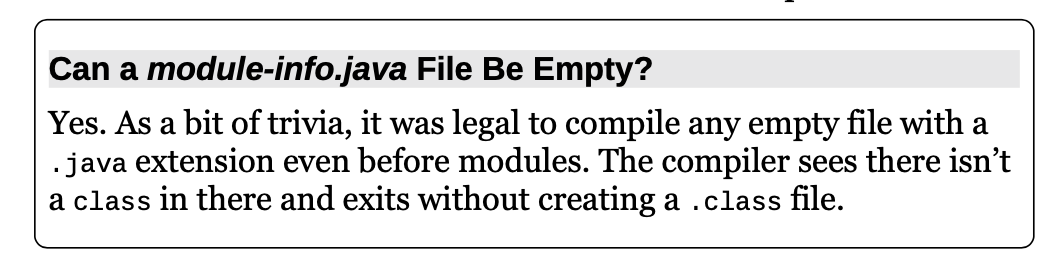 The question was if a module-file.java file can be empty. I relied on the authors on the book and yes, the module-info.java file can be empty.
