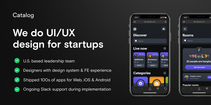 Unblock your engineering team from design. Catalog is a design studio offering unlimited design services for a flat monthly rate. Every client gets a team of 3 - Design Director, Project Manager, and Designer to ensure everything is delivered on time and at a high quality.
