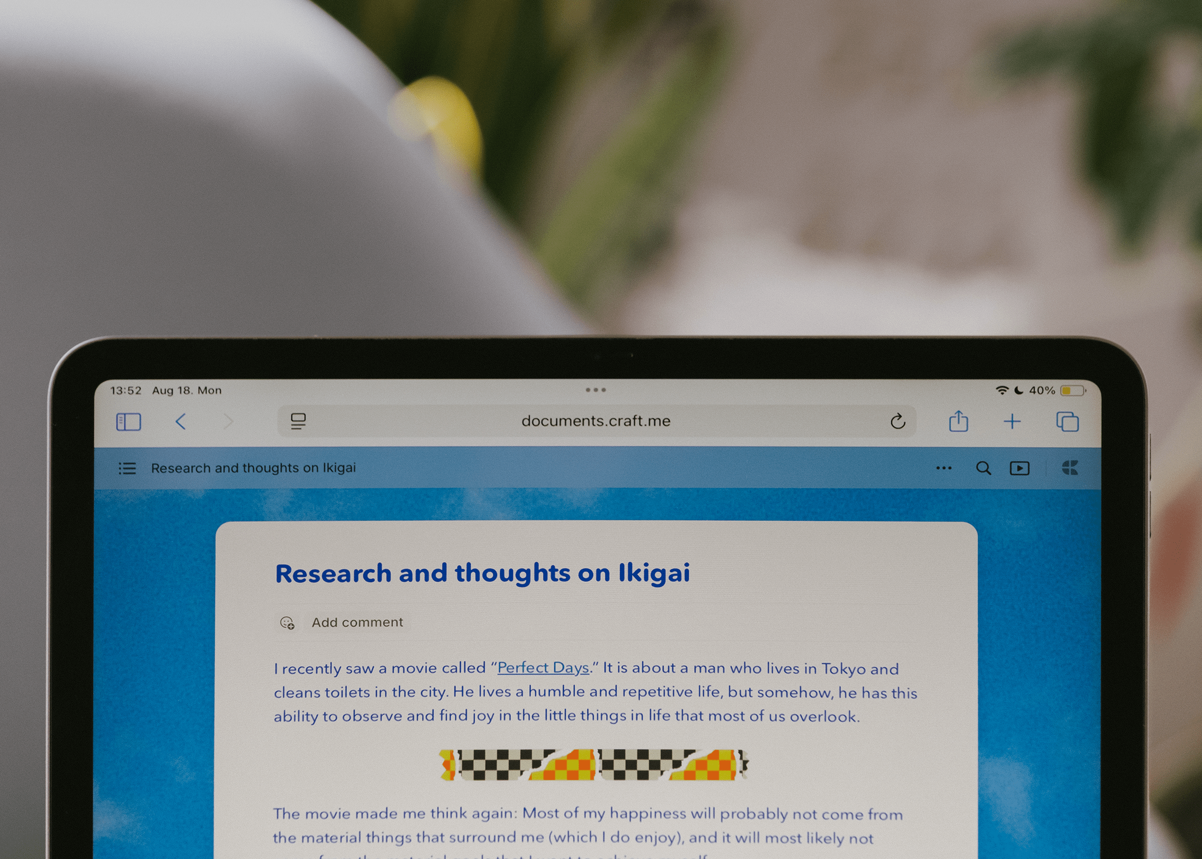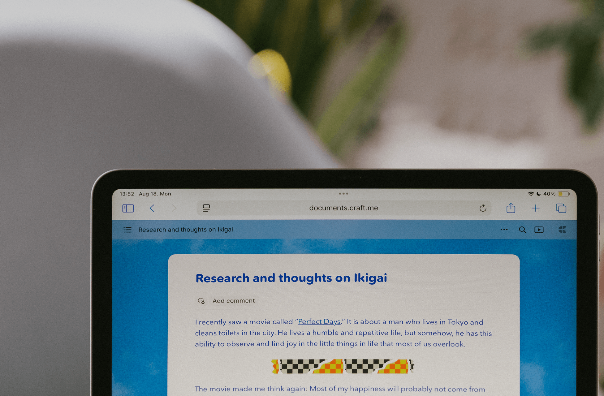 Craft keeps everything, from wardrobe notes to interview outlines, in one beautifully structured place and helps me stay visually inspired and on top of every detail.