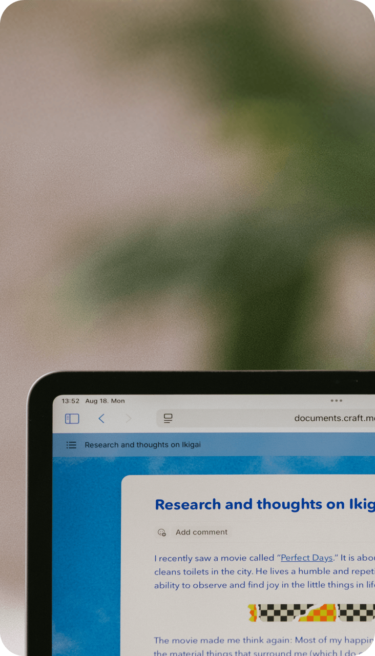 Craft makes sharing feel like part of the writing process. Publish, collaborate, or just send a link — all from the same place you work. Your doc stays clean, clear, and exactly how you styled it. Choose whether to share a live-updating link, invite comments, or publish your work with one click.
