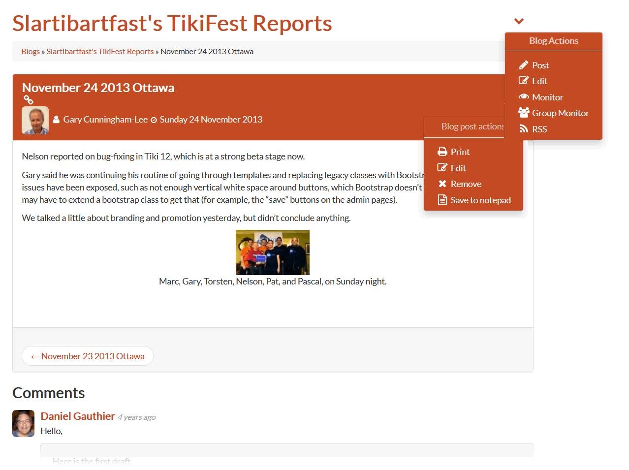 Tiki's Blog feature enables users to enjoy all the best features of weblogs (including RSS output and trackback pings, but without the hassle (and, often, the expense) of using commercial blogging services.