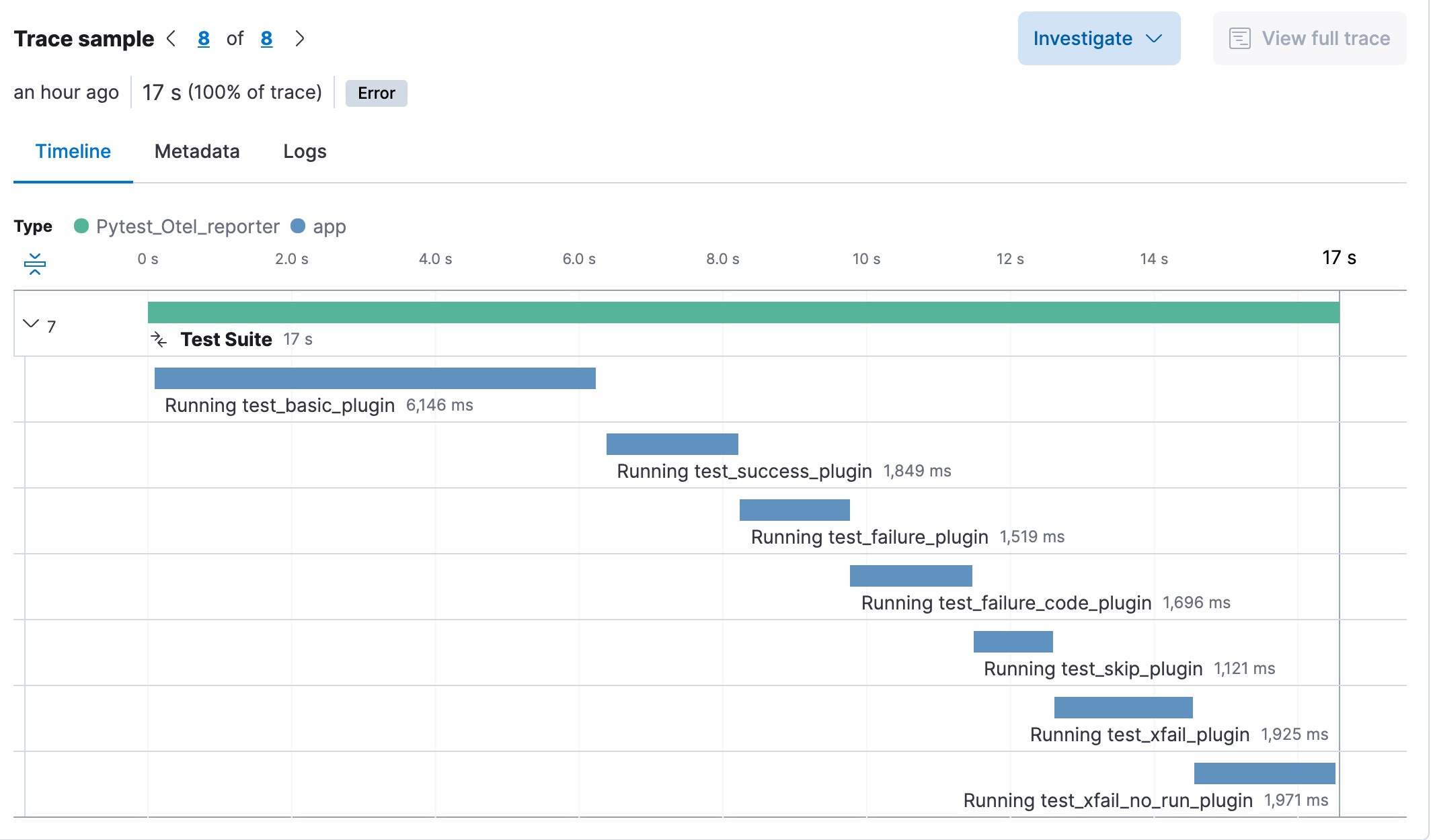 pytest-otel is a pytest plugin for sending Python test results as OpenTelemetry traces. The test traces help you understand test execution, detect bottlenecks, and compare test executions across time to detect misbehavior and issues.