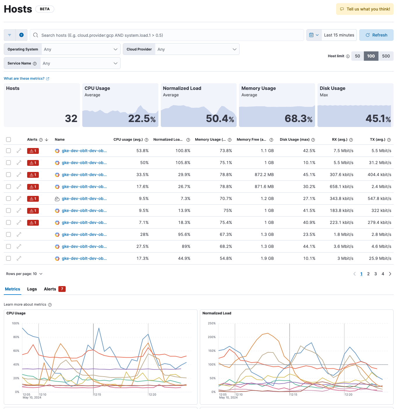 - The Hosts table shows a breakdown of metrics for each host along with an alert count for any hosts with active alerts. You may need to page through the list or change the number of rows displayed on each page to see all of your hosts.