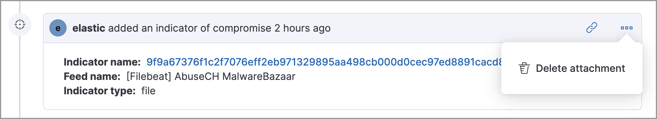 To remove an indicator attached to a case, click the More actions (…) menu → Delete attachment in the case comment.