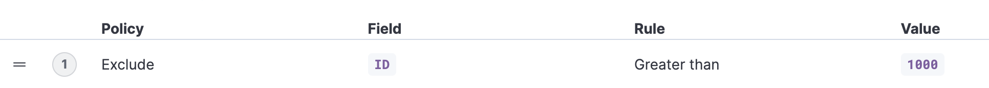 equals- The field value is equal to the specified value.starts_with- The field value starts with the specified (string) value.ends_with- The field value ends with the specified (string) value.contains- The field value includes the specified (string) value.regex- The field value matches the specified regular expression.>- The field value is greater than the specified value.<- The field value is less than the specified value.