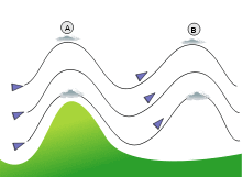 In mountainous areas, local distortion of the airflow becomes severe. Jagged terrain combines to produce unpredictable flow patterns and turbulence, such as rotors, which can be topped by lenticular clouds. Strong updrafts, downdrafts, and eddies develop as the air flows over hills and down valleys. Orographic precipitation occurs on the windward side of mountains and is caused by the rising air motion of a large-scale flow of moist air across the mountain ridge, also known as upslope flow, resulting in adiabatic cooling and condensation. In mountainous parts of the world subjected to relatively consistent winds (for example, the trade winds), a more moist climate usually prevails on the windward side of a mountain than on the leeward or downwind side. Moisture is removed by orographic lift, leaving drier air on the descending and generally warming, leeward side where a rain shadow is observed.[53] Winds that flow over mountains down into lower elevations are known as downslope winds. These winds are warm and dry. In Europe downwind of the Alps, they are known as foehn. In Poland, an example is the halny wiatr. In Argentina, the local name for down sloped winds is zonda. In Java, the local name for such winds is koembang. In New Zealand, they are known as the Nor'west arch, and are accompanied by the cloud formation they are named after that has inspired artwork over the years.[54] In the Great Plains of the United States, these winds are known as a chinook. Downslope winds also occur in the foothills of the Appalachian mountains of the United States,[55] and they can be as strong as other downslope winds [56] and unusual compared to other foehn winds in that the relative humidity typically changes little due to the increased moisture in the source air mass.[57] In California, downslope winds are funneled through mountain passes, which intensify their effect, and examples include the Santa Ana and sundowner winds. Wind speeds during downslope wind effect can exceed 160 kilometers per hour (99 mph).[58]