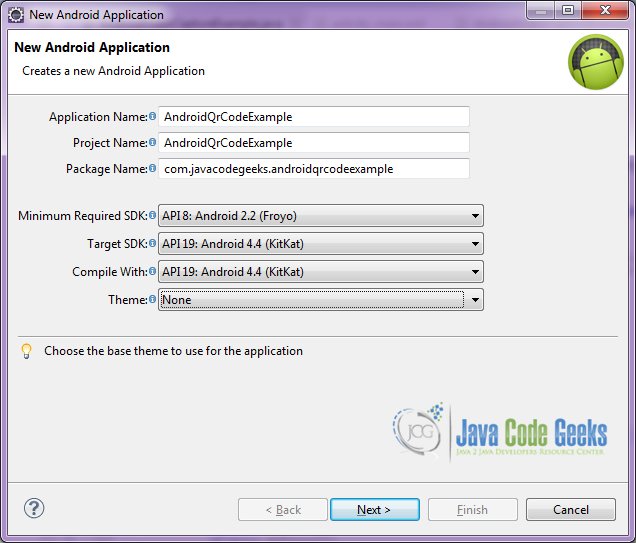 <?xml version="1.0" encoding="utf-8"?> <manifest xmlns:android="http://schemas.android.com/apk/res/android" package="com.javacodegeeks.androidqrcodeexample" android:versionCode="1" android:versionName="1.0" > <uses-sdk android:minSdkVersion="8" android:targetSdkVersion="19" /> <application android:allowBackup="true" android:icon="@drawable/ic_launcher" android:label="@string/app_name" > <activity android:name="com.javacodegeeks.androidqrcodeexample.AndroidBarcodeQrExample" android:label="@string/app_name" > <intent-filter> <action android:name="android.intent.action.MAIN" /> <category android:name="android.intent.category.LAUNCHER" /> </intent-filter> </activity> </application> </manifest>