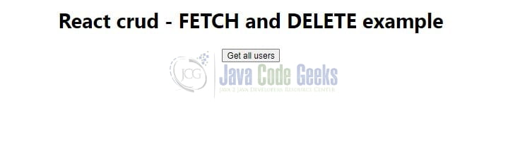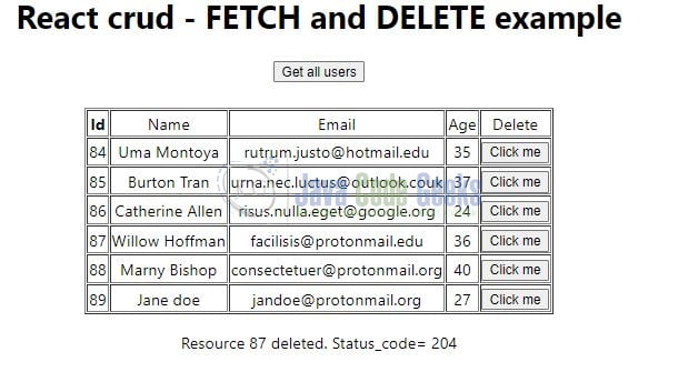import React, { useState } from "react"; import "./App.css"; // a separate nodejs application is running in the backend function App() { let [data, setData] = useState(null); let [status, setStatus] = useState(null); async function getUsers() { setStatus(null); // clear status on retrigger try { // get all users' endpoint const res = await fetch("http://localhost:9500/all"); if (!res.ok) throw new Error("Some error has occurred."); const users = await res.json(); setData(users.data); } catch (err) { // console.log("error occurred", err); setStatus({ type: "error", message: err.message, }); } } async function deleteUser(param) { setStatus(null); // clear status on retrigger try { // delete user endpoint const res = await fetch(`http://localhost:9500/id/${param}`, { method: "delete", }); setStatus({ type: "pass", status: res.status, message: `${param} deleted`, }); // if deletion is successful reload the table after x seconds setTimeout(function () { getUsers(); }, 3000); } catch (err) { // console.log("error occurred", err); setStatus({ type: "fail", message: err.message, }); } } return ( <div className="App"> <h1>React crud - FETCH and DELETE example</h1> <button onClick={getUsers}>Get all users</button> <div id="data"> {data !== null && data.length > 0 && ( <table className="usersTbl" border="1"> <thead> <tr> <td> <strong>Id</strong> </td> <td>Name</td> <td>Email</td> <td>Age</td> <td>Delete</td> </tr> </thead> <tbody> {data.map((item, i) => ( <tr key={i}> <td>{item.id}</td> <td>{item.name}</td> <td>{item.email}</td> <td>{item.age}</td> <td> <button onClick={() => deleteUser(item.id)}> Click me </button> </td> </tr> ))} </tbody> </table> )} {data !== null && data.length === 0 && <p>No items were found...</p>} </div> <div id="message"> {status !== null && status?.type === "pass" && ( <p> Resource {status?.message}. Status_code= {status?.status} </p> )} {status !== null && status?.type === "fail" && <p>{status?.message}</p>} </div> </div> ); } export default App; 3. Run the React Fetch API App