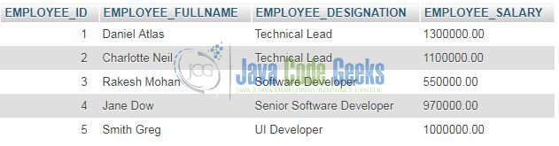 -- -- Create database `springjdbcrowmapper` -- CREATE DATABASE springjdbcrowmapper; -- -- Table structure for table `employee_tbl` -- CREATE TABLE `employee_tbl` ( `EMPLOYEE_ID` int(11) NOT NULL AUTO_INCREMENT, `EMPLOYEE_FULLNAME` varchar(100) NOT NULL, `EMPLOYEE_DESIGNATION` varchar(100) NOT NULL, `EMPLOYEE_SALARY` decimal(10,2) NOT NULL ) ENGINE=InnoDB DEFAULT CHARSET=latin1; -- -- Dumping data for table `employee_tbl` -- INSERT INTO `employee_tbl` (`EMPLOYEE_ID`, `EMPLOYEE_FULLNAME`, `EMPLOYEE_DESIGNATION`, `EMPLOYEE_SALARY`) VALUES (1, 'Daniel Atlas', 'Technical Lead', '1300000.00'), (2, 'Charlotte Neil', 'Technical Lead', '1100000.00'), (3, 'Rakesh Mohan', 'Software Developer', '550000.00'), (4, 'Jane Dow', 'Senior Software Developer', '970000.00'), (5, 'Smith Greg', 'UI Developer', '1000000.00'); -- -- Selecting data from table `employee_tbl` -- SELECT * FROM `employee_tbl`;