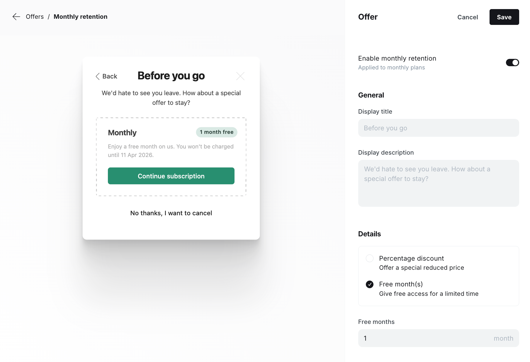 Once activated, retention offers can be customized to offer a set amount of free months off, or a percentage discount off of upcoming payments.