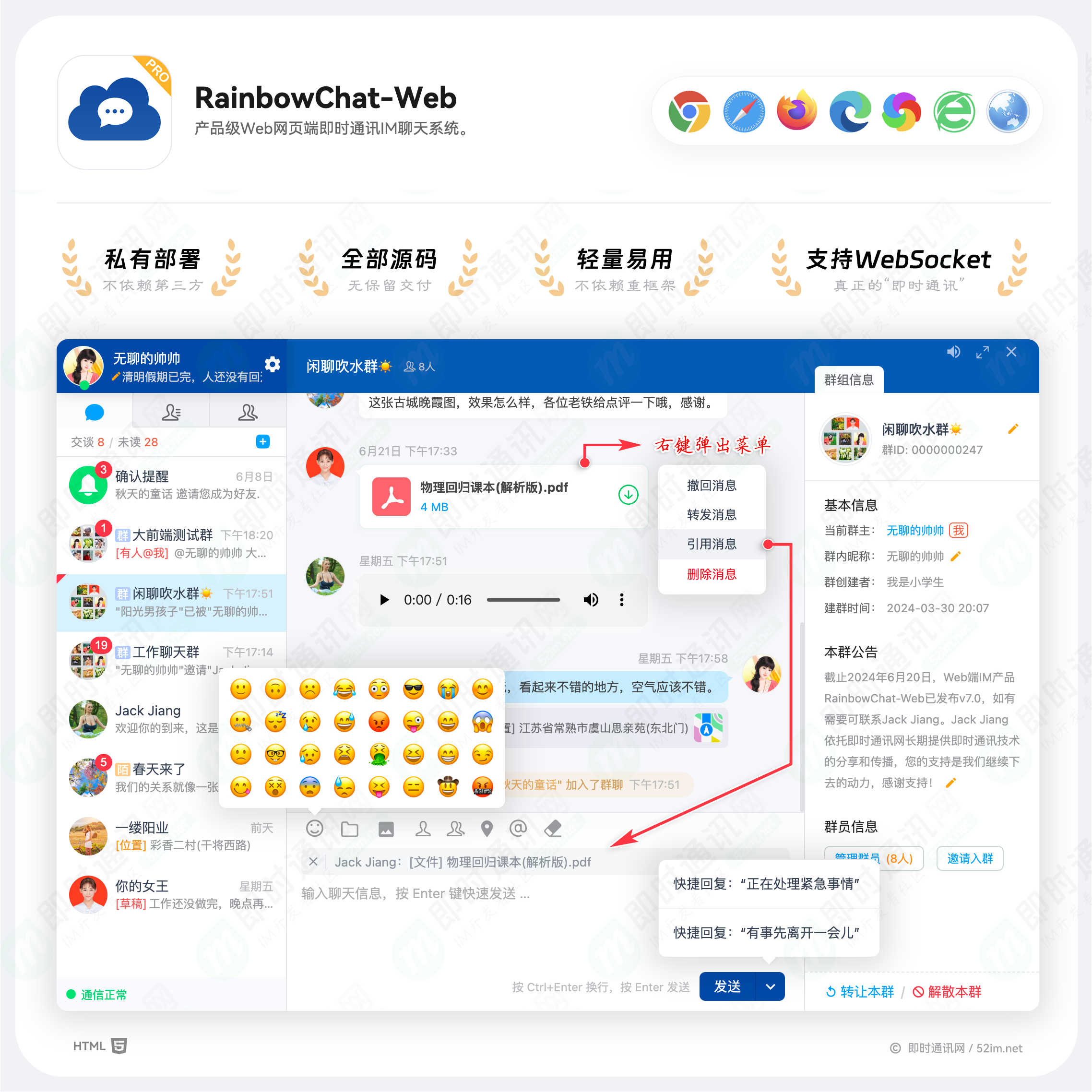 - 可应用于跨设备、跨网络的聊天APP、企业OA、消息推送等各种场景。