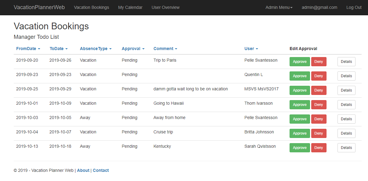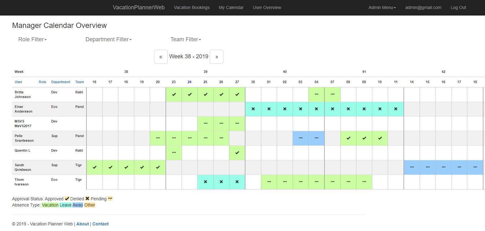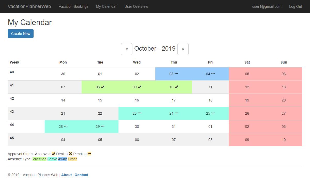 VacationPlannerWeb A website where you can book and manage your vacation leave in your organization. Link to the Website on Azure: https://vacationplannerweb20190923103617.azurewebsites.net/ (Offline) Features Book your vacation Manage the vacation bookings Get an overview of the bookings
