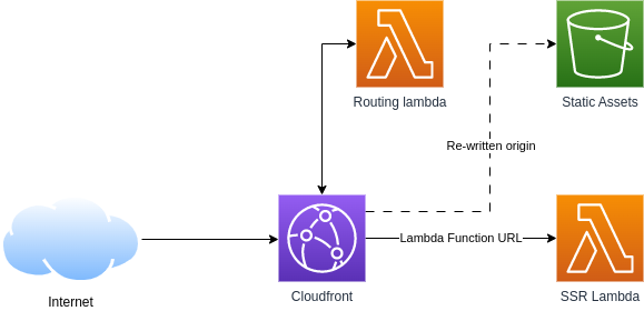 To server static assets and precompiled pages, this adapter makes use of S3. In order to route traffic to the correct destination a Lambda@edge function is used to perform an origin rewrite to redirect traffic to the S3 Bucket.