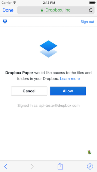 #import <ObjectiveDropboxOfficial/ObjectiveDropboxOfficial.h> - (void)scene:(UIScene *)scene openURLContexts:(NSSet<UIOpenURLContext *> *)URLContexts { DBOAuthCompletion completion = ^(DBOAuthResult *authResult) { if (authResult != nil) { if ([authResult isSuccess]) { NSLog(@"\n\nSuccess! User is logged into Dropbox.\n\n"); } else if ([authResult isCancel]) { NSLog(@"\n\nAuthorization flow was manually canceled by user!\n\n"); } else if ([authResult isError]) { NSLog(@"\n\nError: %@\n\n", authResult); } } }; for (UIOpenURLContext *context in URLContexts) { if ([DBClientsManager handleRedirectURL:context.URL completion:completion]) { // stop iterating after the first handle-able url break; } } }#import <ObjectiveDropboxOfficial/ObjectiveDropboxOfficial.h> // generic launch handler - (void)applicationWillFinishLaunching:(NSNotification *)notification { [[NSAppleEventManager sharedAppleEventManager] setEventHandler:self andSelector:@selector(handleAppleEvent:withReplyEvent:) forEventClass:kInternetEventClass andEventID:kAEGetURL]; } // custom handler - (void)handleAppleEvent:(NSAppleEventDescriptor *)event withReplyEvent:(NSAppleEventDescriptor *)replyEvent { NSURL *url = [NSURL URLWithString:[[event paramDescriptorForKeyword:keyDirectObject] stringValue]]; DBOAuthCompletion oauthCompletion = ^(DBOAuthResult *authResult) { if (authResult != nil) { if ([authResult isSuccess]) { NSLog(@"\n\nSuccess! User is logged into Dropbox.\n\n"); } else if ([authResult isCancel]) { NSLog(@"\n\nAuthorization flow was manually canceled by user!\n\n"); } else if ([authResult isError]) { NSLog(@"\n\nError: %@\n\n", authResult); } // this forces your app to the foreground, after it has handled the browser redirect [[NSRunningApplication currentApplication] activateWithOptions:(NSApplicationActivateAllWindows | NSApplicationActivateIgnoringOtherApps)]; } }; [DBClientsManager handleRedirectURL:url completion:oauthCompletion]; }After the end user signs in with their Dropbox login credentials on mobile, they will see a window like this: