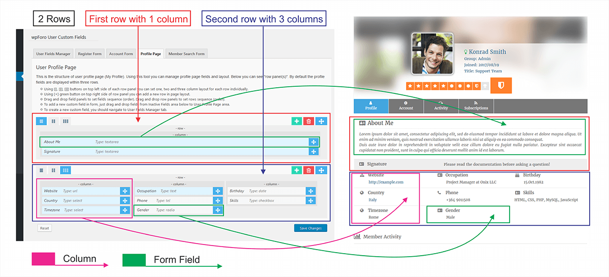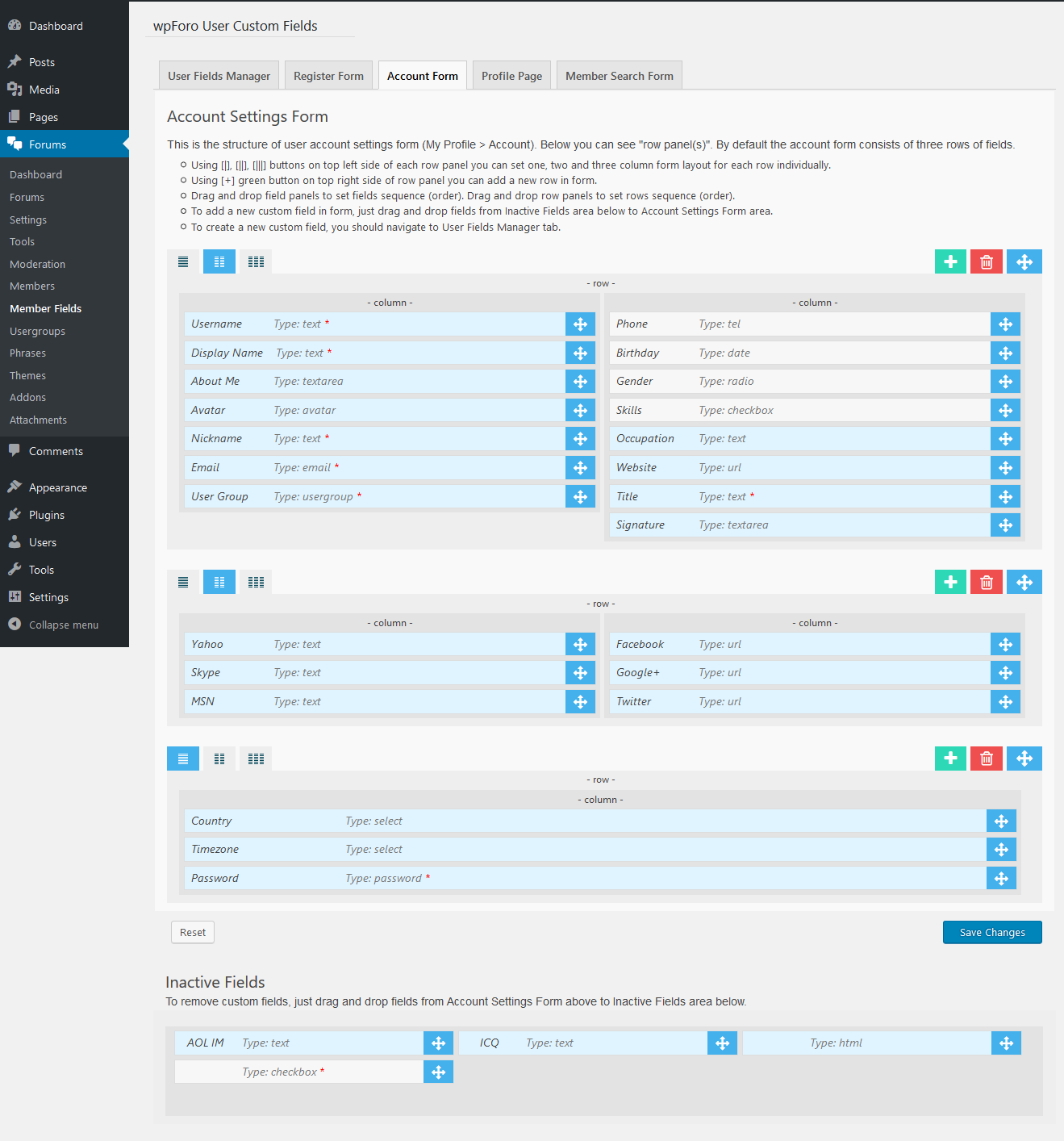 This is an advanced user profile builder system designed for creating powerful online community and membership site. It includes form builder tools for Registration form, Account Settings form and for Members Search form. Also you can manage User Profile page fields and layout with a similar tool. Once addon is installed all available default fields will be listed on addon field settings page. Here you can manage default fields and create new fields. You can find more information in wpForo User Custom Fields Documentation.