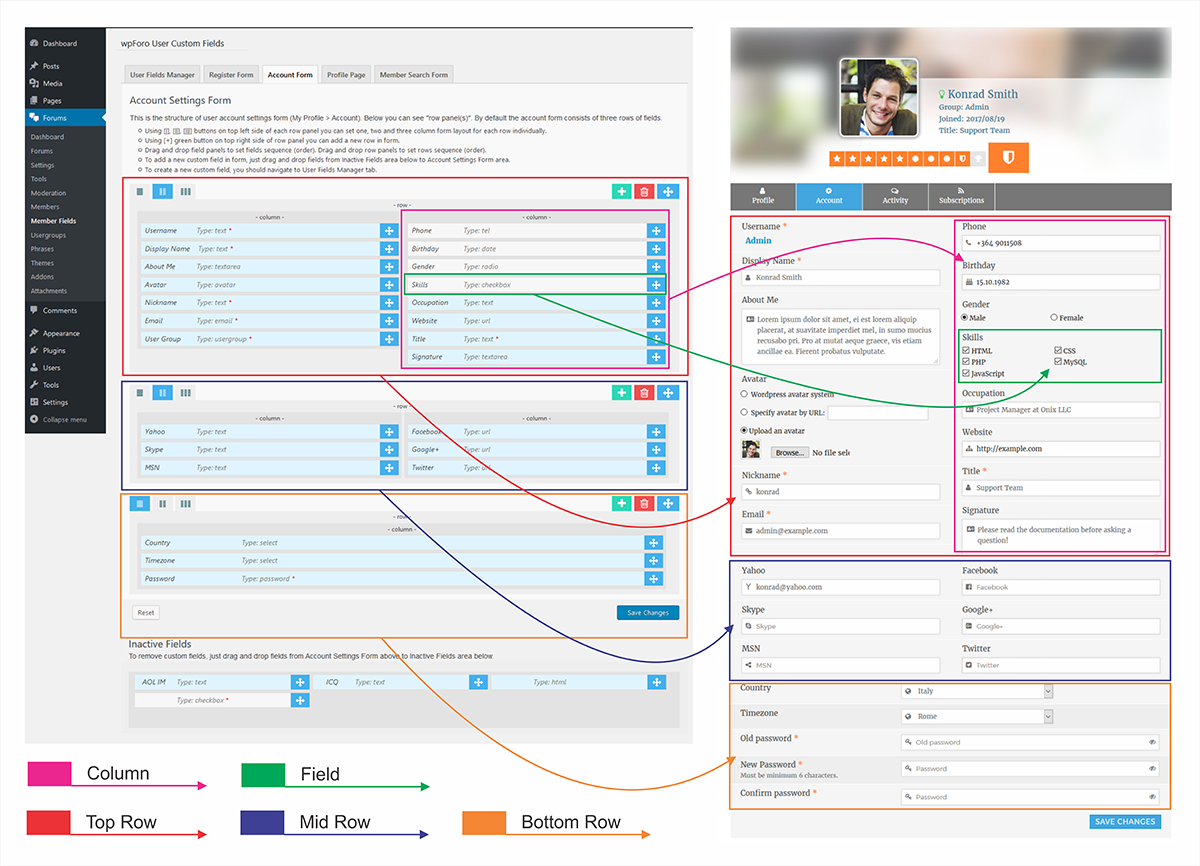 - Field types: Text, Email, Phone, Url, Date, Color Picker, Number, Password, Drop Down, Radio, Checkbox, Textarea, File Upload, Avatar, Usergroup, HTML.