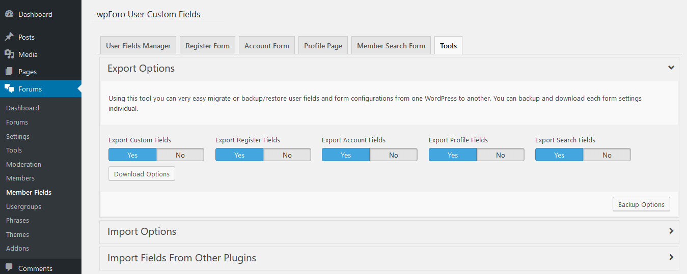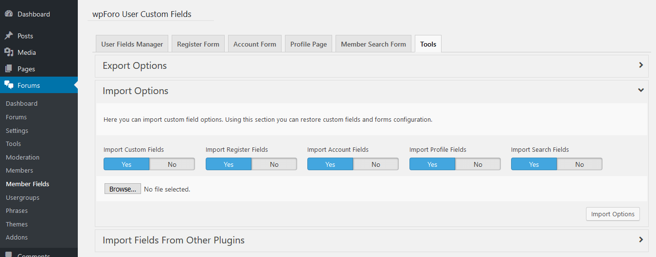 - Once the plugin is active, navigate to WordPress Dashboard > Forums > Member Fields to begin configuration…