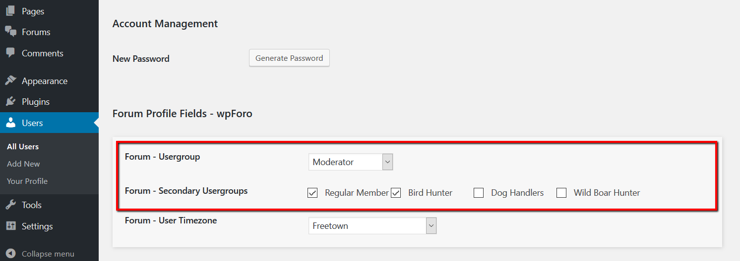 One of the main advantages of wpForo forum plugin is the Secondary Usergroups feature. Using the Secondary Usergroups you can set more than one Usergroup to a forum user in user management pages, such as My Profile > Account on forum front-end and in Dashboard > Users > Edit User admin page. Granting multiple Usergroups to users you can grant different accesses to different forums.