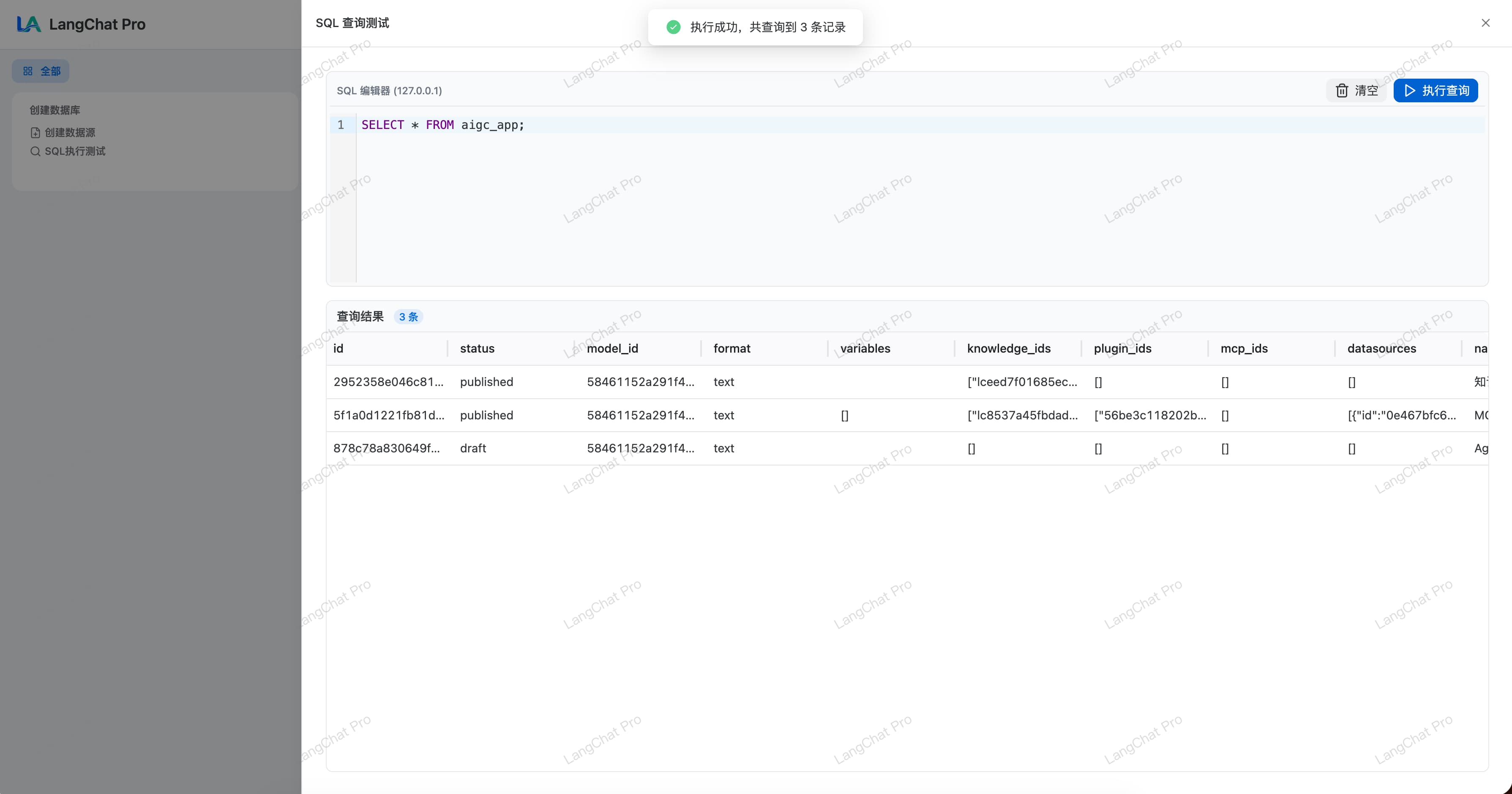 在 AI 工作流中直接执行 SQL 往往潜伏着巨大的安全风险(如数据注入、误删关键表等)。LangChat Pro 引入了内建的严格白名单拦截机制: