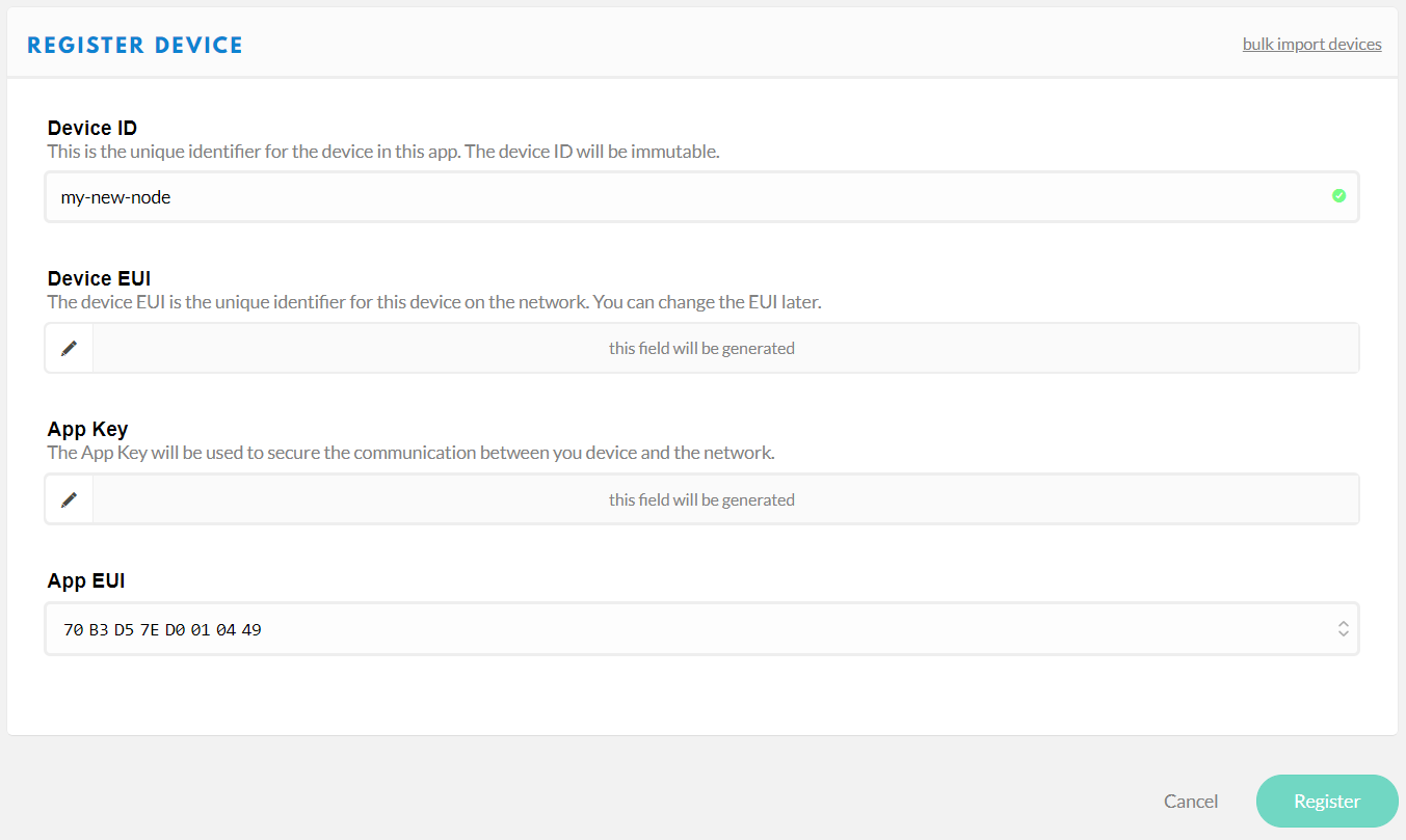 Before you can program your first node, you'll need to register a device on The Things Network. Registering allows the network to generate the necessary keys which you'll then place in your code so that the network recognizes your device.