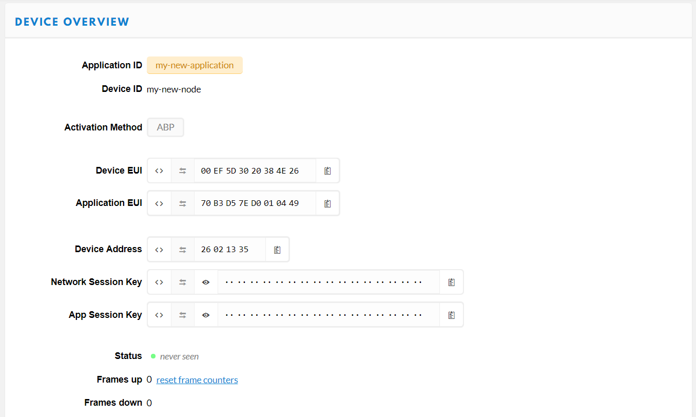 You'll notice that, by default, the Network Session Key and App Session Key fields are obscured for security reasons. You can click the eye icon to show the code before copying it. Also, it will be easier to copy this into the example code if you click the <> button to show the codes in "C style".