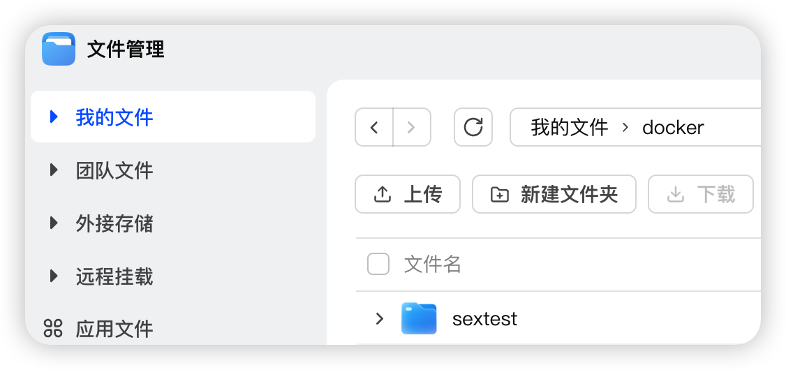 打开 NAS 的「文件管理」,找到 docker 文件夹,在其内部新建一个名为 sextest 的文件夹。