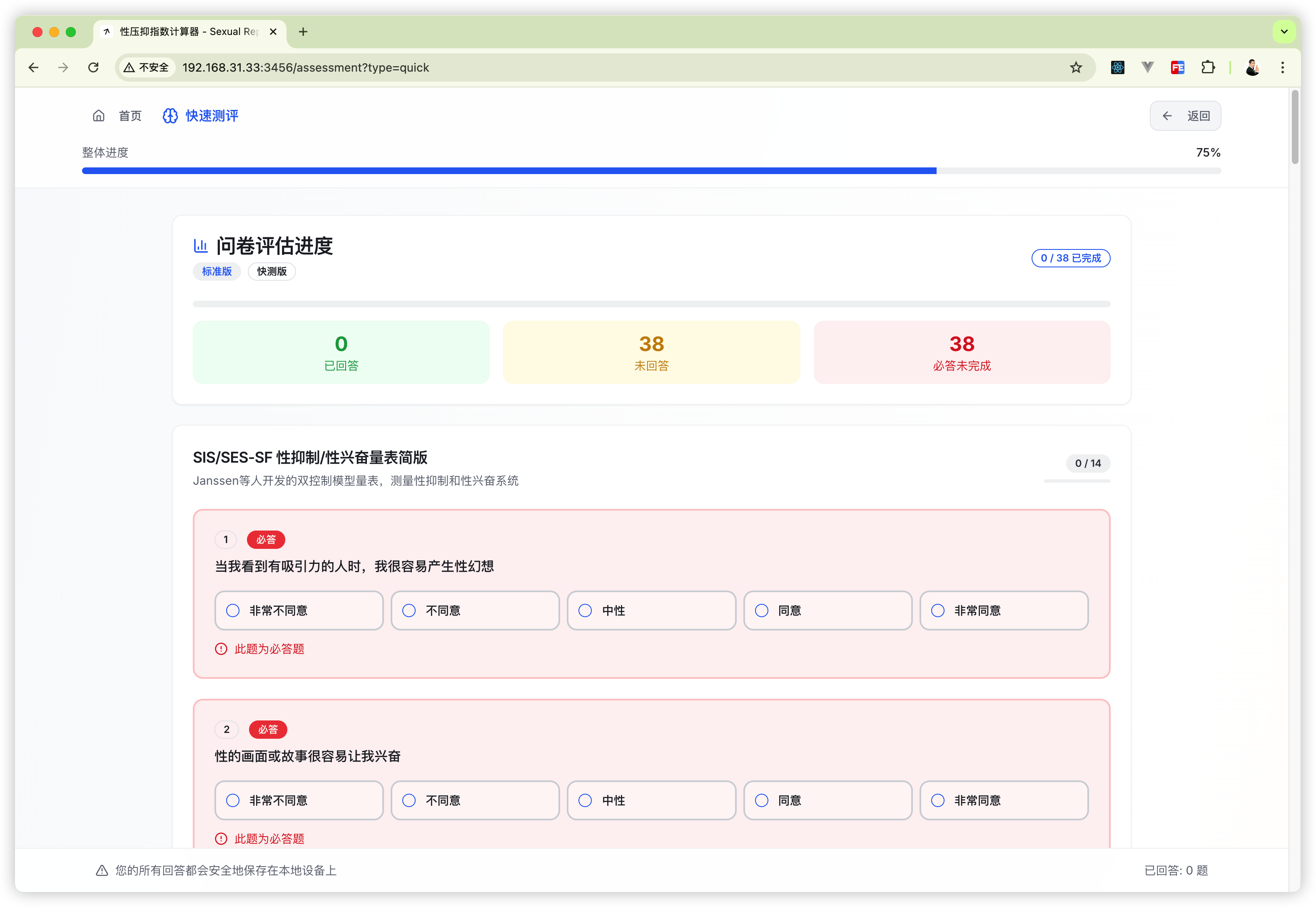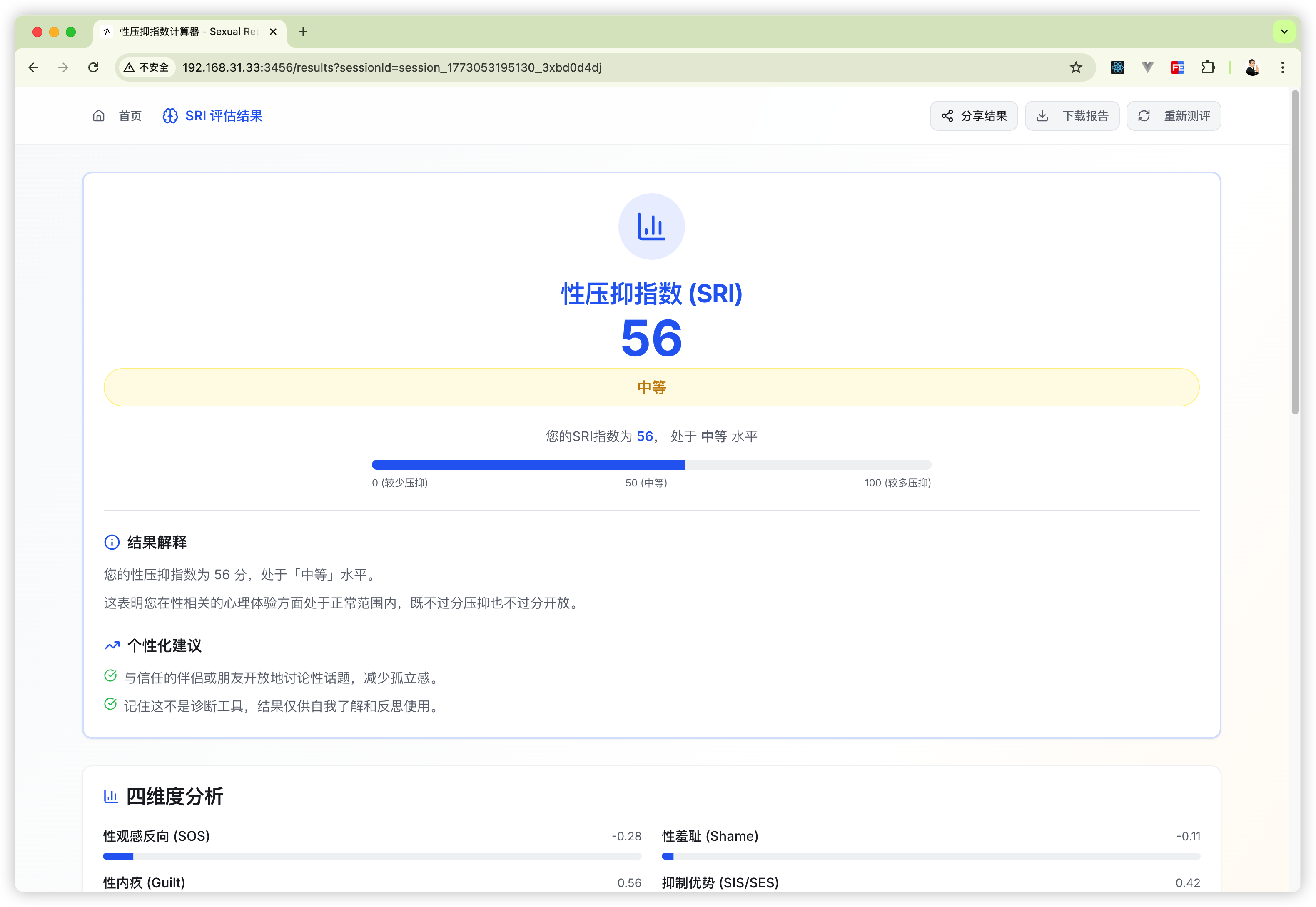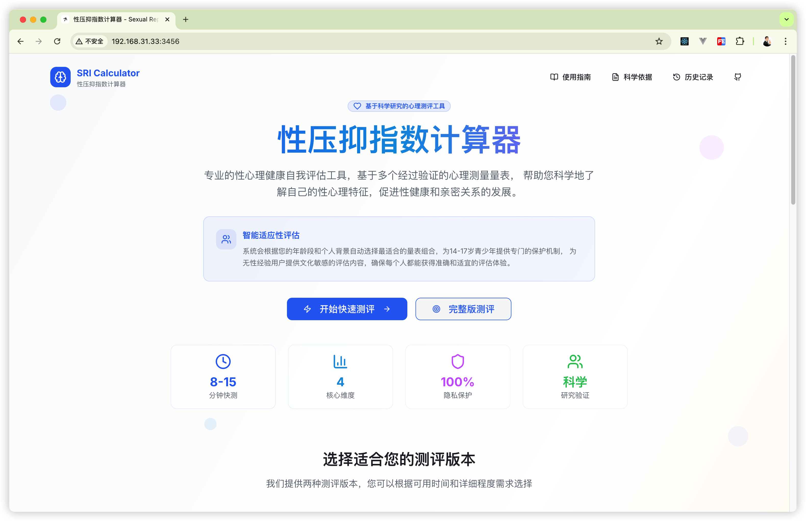 Sexual Calculator 是一个基于心理学维度开发的“性压抑程度”评测工具。 它通过一系列精心设计的问题,帮助你审视内心的真实状态。数据完全本地化处理,部署在 NAS 上,你的秘密只有你和你的硬盘知道。