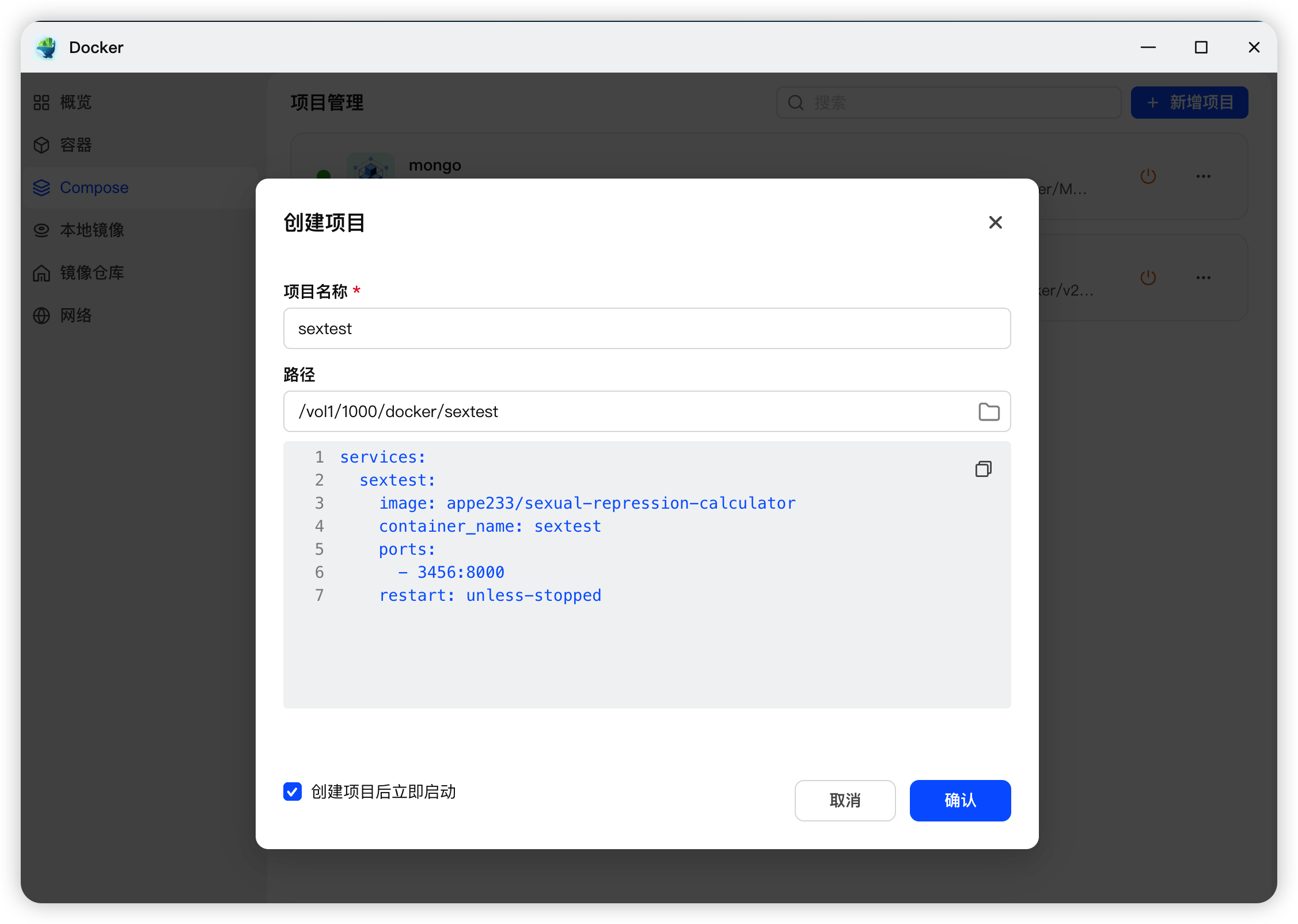 services: sextest: image: appe233/sexual-repression-calculator container_name: sextest ports: - 3456:8000 # 冒号左侧的 3456 端口可以自定义 restart: unless-stopped 等待项目构建成功后,在浏览器访问 NAS_IP:3456 即可打开 xxx