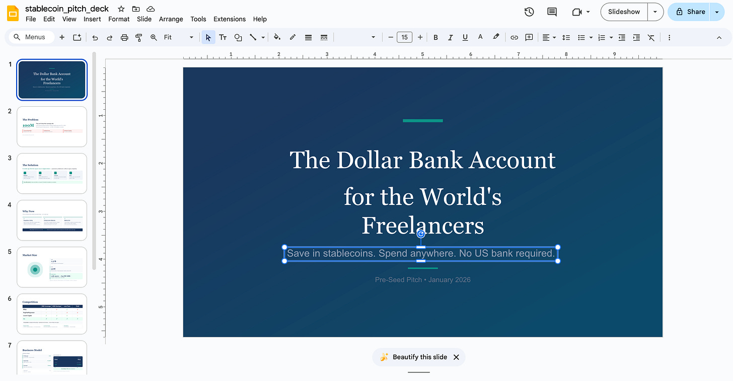 For VCs: due diligence gets easier when portfolio companies can generate institutional-quality documents. But evaluation gets harder because the signal-to-noise ratio changes. The founder who produces a crisp pitch deck might be operating alone with AI assistance, or might have a full team. The artifacts tell you less about organizational capacity than they used to.