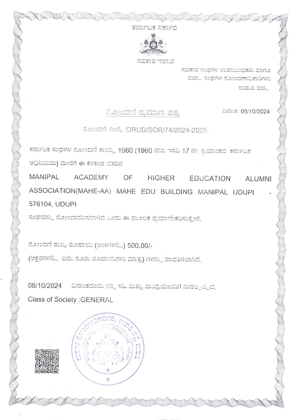 MAHE ALUMNI ASSOCIATION REGISTRATION CERTIFICATE