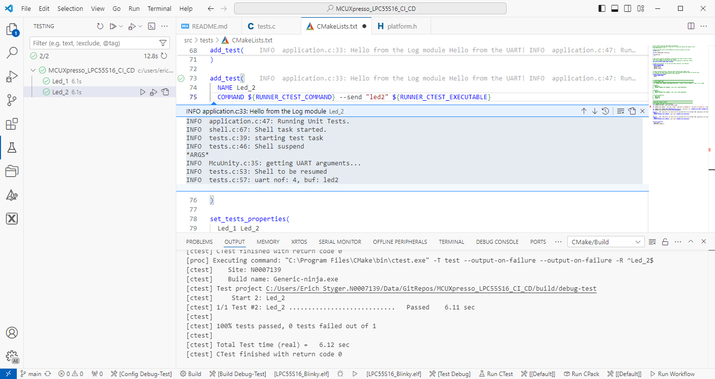 The release 24.9.75 of LinkServer software and tools includes interesting feature: the ability to use the debug probe for automated on-target testing. It includes a ‘runner’ which can program, launch and run the application on the target through a debug probe. While the target is running, it uses semihosting or UART for communication. This makes it a perfect tool for automated testing, especially in a CI/CD environment. One such environment is running automated tests with CMake and CTest in VS Code.