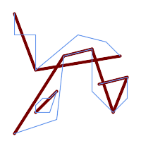 SELECT ST_Npoints(geom) AS np_before, ST_NPoints(ST_Simplify(geom, 0.1)) AS np01_notbadcircle, ST_NPoints(ST_Simplify(geom, 0.5)) AS np05_notquitecircle, ST_NPoints(ST_Simplify(geom, 1)) AS np1_octagon, ST_NPoints(ST_Simplify(geom, 10)) AS np10_triangle, (ST_Simplify(geom, 100) is null) AS np100_geometrygoesaway FROM (SELECT ST_Buffer('POINT(1 3)', 10,12) As geom) AS t; np_before | np01_notbadcircle | np05_notquitecircle | np1_octagon | np10_triangle | np100_geometrygoesaway -----------+-------------------+---------------------+-------------+---------------+------------------------ 49 | 33 | 17 | 9 | 4 | t Simplifying a set of lines. Lines may intersect after simplification.