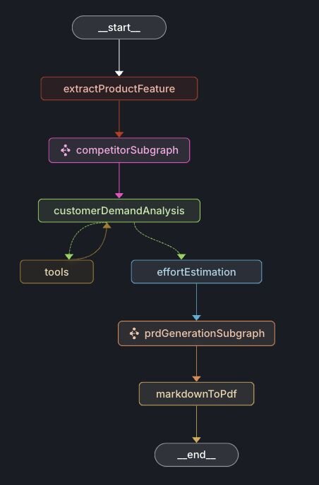 // Output { "tshirtSize": { "size": "M", "personMonths": 4.5, //over all effort "rationale": "Medium complexity with existing infrastructure support" }, "components": [ // sub tasks effort { "name": "Backend API", "description": "Implement REST endpoints for data processing", "effortMonths": 2, "customerImpact": "Enables real-time data access for FinTech Solutions", "technicalComplexity": "Medium" } //... ] }- prdGenerationSubgraph: Creates PRD sections including executive summary, customer analysis, market research, product strategy, and implementation strategy.