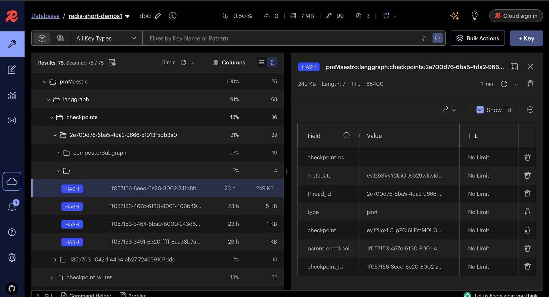 Below is a screenshot illustrating checkpointer data stored in Redis Insight: