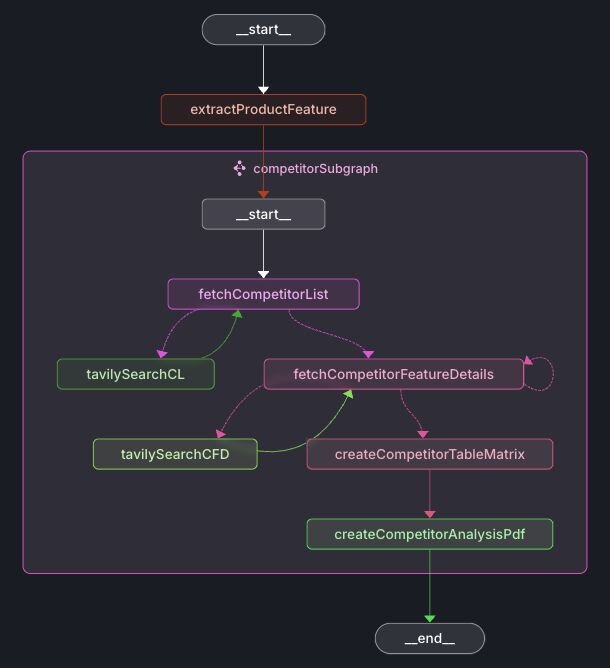 The nodes extractProductFeature and competitorSubgraph are identical to those in the Market Research workflow.