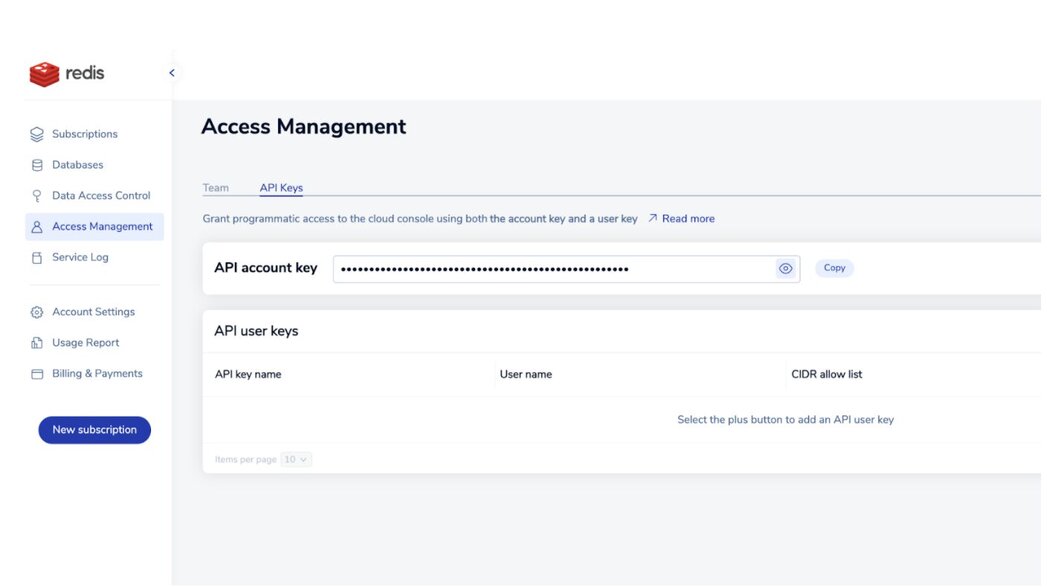 In order to set up authentication with the Redis Cloud provider, a programmatic API key must be generated for Redis Cloud. The Redis Cloud documentation contains the most up-to-date instructions for creating and managing your key(s) and IP access.