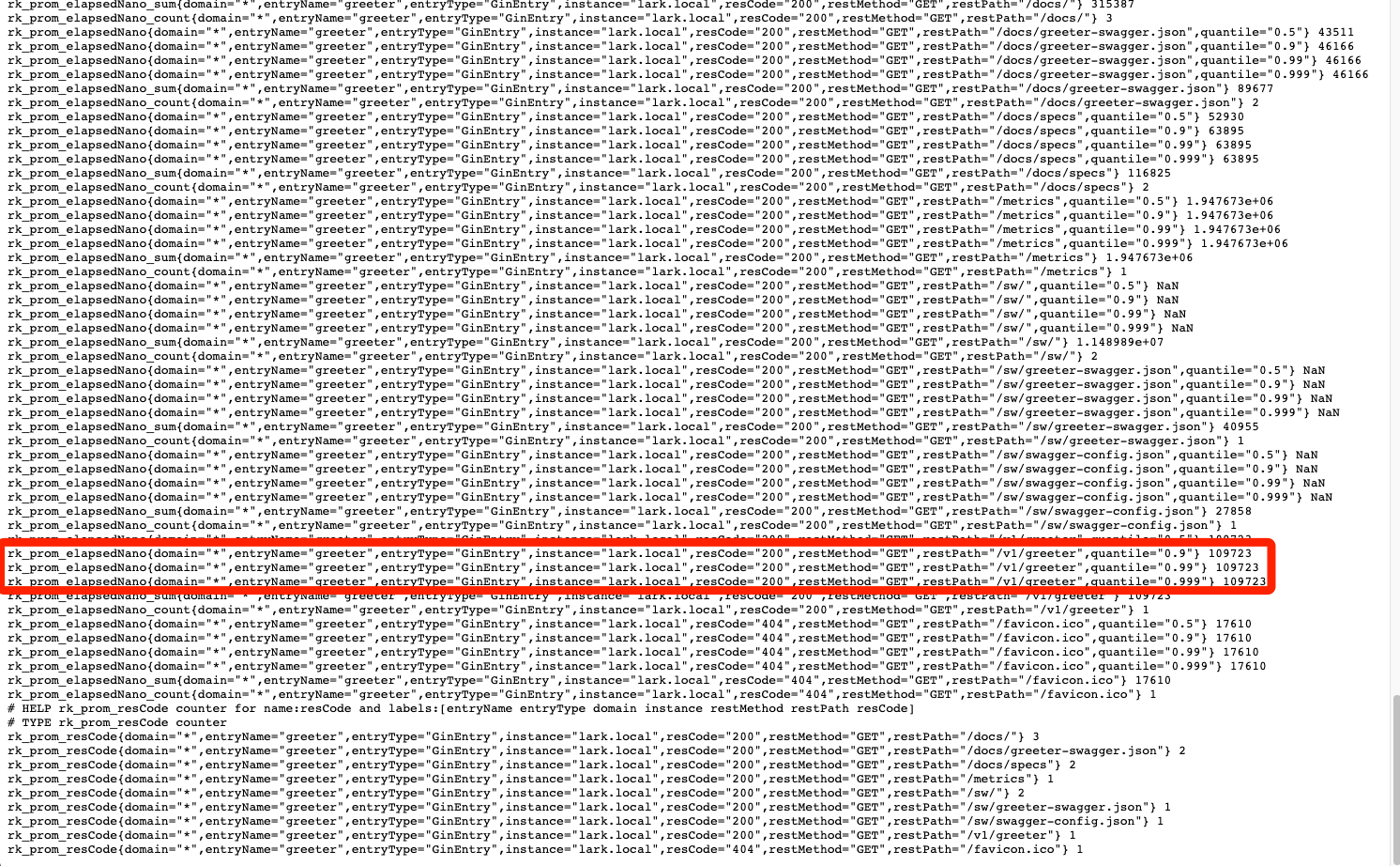 ------------------------------------------------------------------------ endTime=2022-05-09T19:13:21.975646+08:00 startTime=2022-05-09T19:13:21.975545+08:00 elapsedNano=101406 timezone=CST ids={"eventId":"57ae5290-b0e6-44ac-a614-c40b03fb90d0","requestId":"57ae5290-b0e6-44ac-a614-c40b03fb90d0"} app={"appName":"rk","appVersion":"local","entryName":"greeter","entryType":"MuxEntry"} env={"arch":"amd64","domain":"*","hostname":"lark.local","localIP":"192.168.101.5","os":"darwin"} payloads={"apiMethod":"GET","apiPath":"/v1/greeter","apiProtocol":"HTTP/1.1","apiQuery":"name=rk-dev","userAgent":"curl/7.64.1"} counters={} pairs={} timing={} remoteAddr=127.0.0.1:61069 operation=/v1/greeter resCode=200 eventStatus=Ended EOE 6.6 Prometheus Metrics#