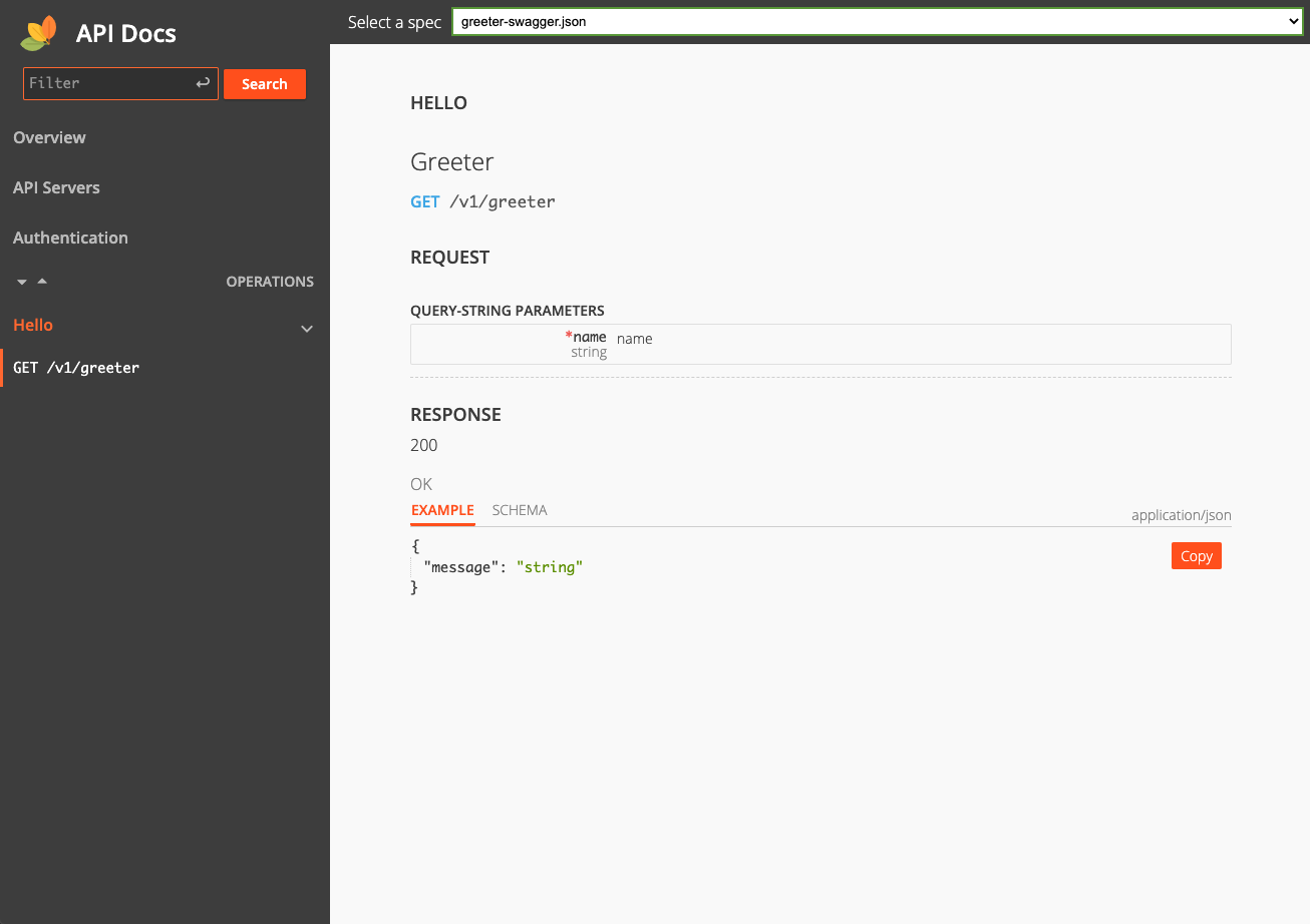 // Copyright (c) 2021 rookie-ninja // // Use of this source code is governed by an Apache-style // license that can be found in the LICENSE file. package main import ( "context" "fmt" "github.com/rookie-ninja/rk-boot/v2" "github.com/rookie-ninja/rk-mux/boot" "github.com/rookie-ninja/rk-mux/middleware" "net/http" ) // @title RK Swagger for Mux // @version 1.0 // @description This is a greeter service with rk-boot. func main() { // Create a new boot instance. boot := rkboot.NewBoot() // Get MuxEntry muxEntry := rkmux.GetMuxEntry("greeter") // Use *mux.Router adding handler. muxEntry.Router.NewRoute().Path("/v1/greeter").HandlerFunc(Greeter) // Bootstrap boot.Bootstrap(context.TODO()) boot.WaitForShutdownSig(context.TODO()) } // Greeter handler // @Summary Greeter service // @Id 1 // @version 1.0 // @produce application/json // @Param name query string true "Input name" // @Success 200 {object} GreeterResponse // @Router /v1/greeter [get] func Greeter(writer http.ResponseWriter, req *http.Request) { rkmuxmid.WriteJson(writer, http.StatusOK, &GreeterResponse{ Message: fmt.Sprintf("Hello %s!", req.URL.Query().Get("name")), }) } type GreeterResponse struct { Message string } 3.Generate swagger.json#