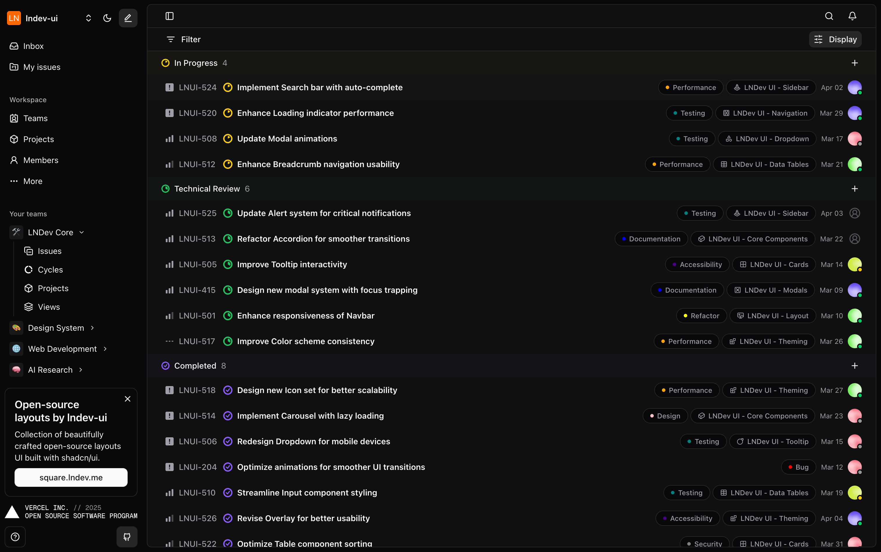 Project management interface inspired by Linear. This application allows tracking of issues, projects and teams.