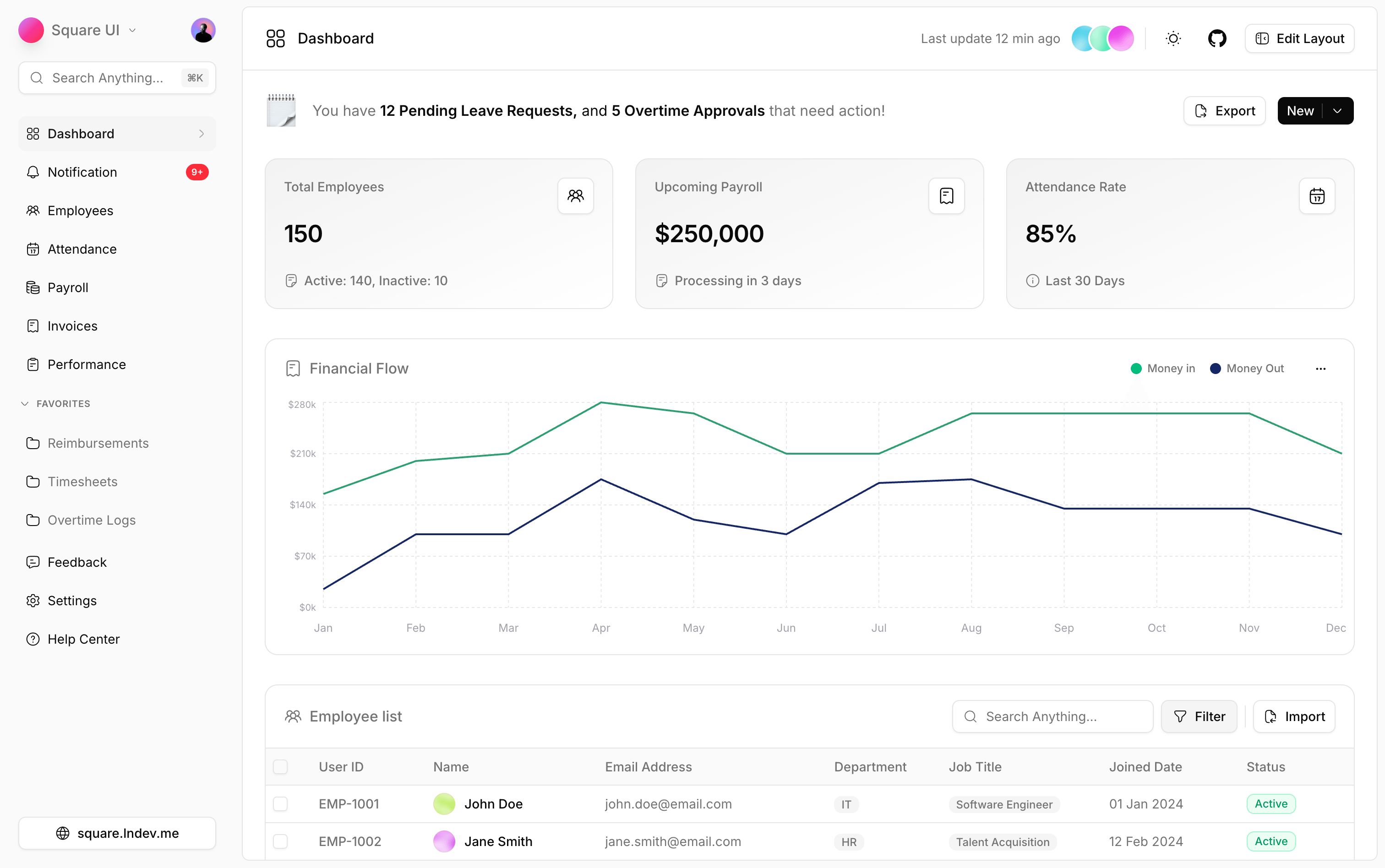 Modern HR dashboard with financial flow chart, employee list with filters, and layout customization.