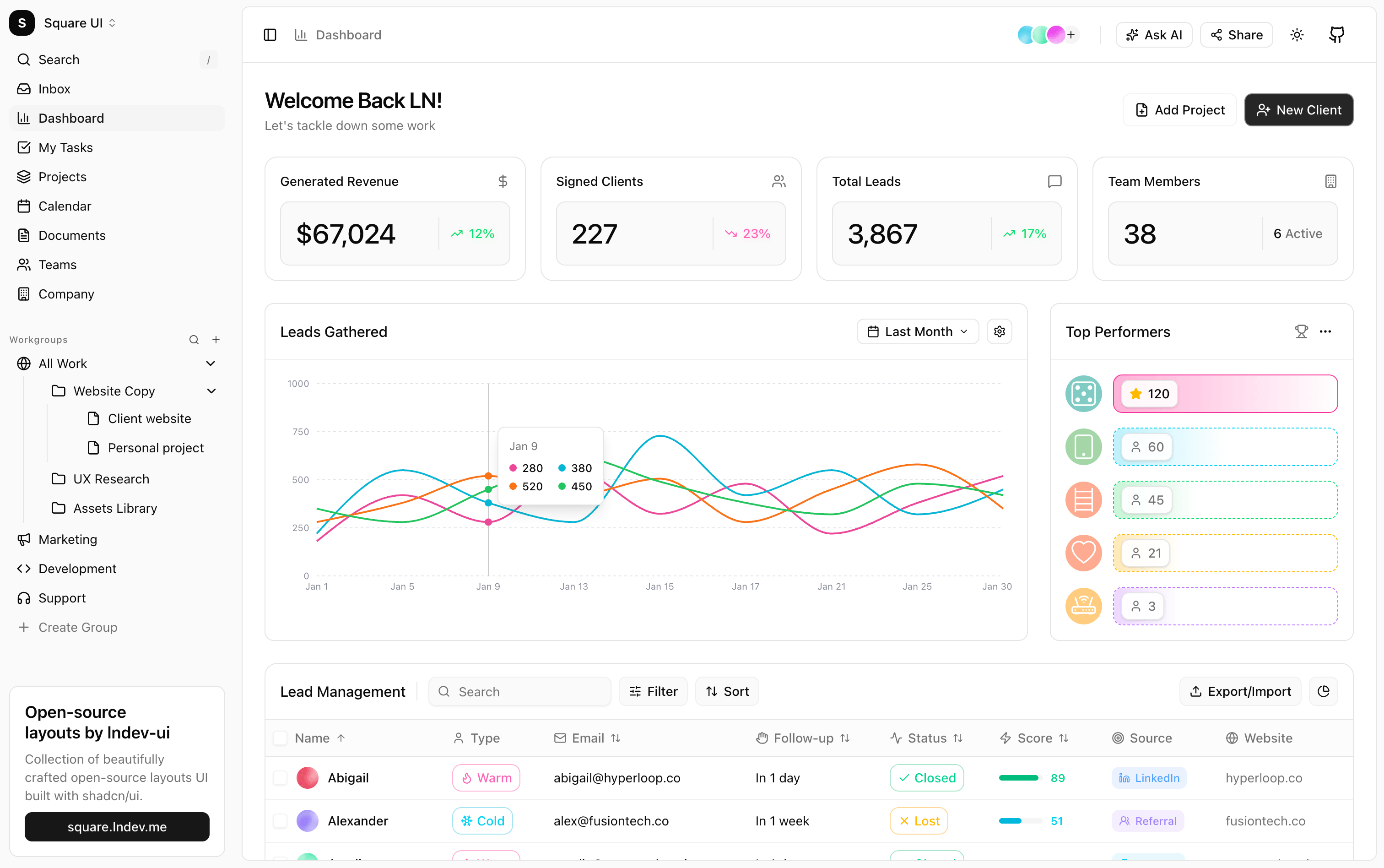 Modern dashboard with workgroups, multi-line leads chart, top performers, and lead management table.