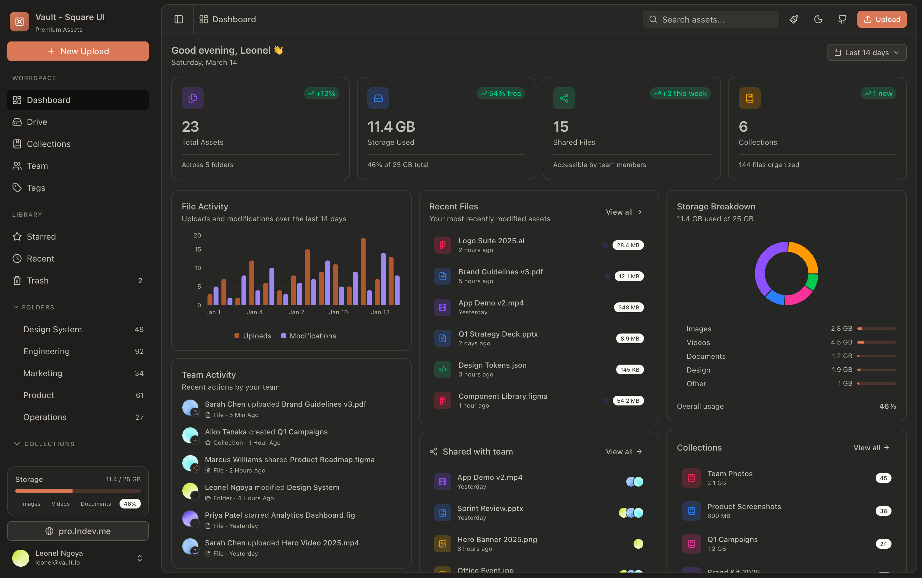 Premium digital asset management with drive, collections, tags, team collaboration, and storage analytics.