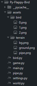 $ pip install pygame After that, create a directory for the game and create the following .py files inside it: settings.py, main.py, world.py, game.py, pipe.py, bird.py. Create also another folder inside the game directory and name it assets, which we'll use to store game media files. Here is the file structure of our code: