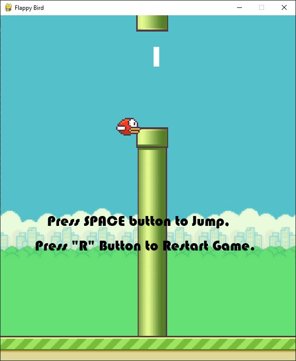 # game.py import pygame from settings import WIDTH, HEIGHT pygame.font.init() class GameIndicator: def __init__(self, screen): self.screen = screen self.font = pygame.font.SysFont('Bauhaus 93', 60) self.inst_font = pygame.font.SysFont('Bauhaus 93', 30) self.color = pygame.Color("white") self.inst_color = pygame.Color("black") def show_score(self, int_score): bird_score = str(int_score) score = self.font.render(bird_score, True, self.color) self.screen.blit(score, (WIDTH // 2, 50)) def instructions(self): inst_text1 = "Press SPACE button to Jump," inst_text2 = "Press \"R\" Button to Restart Game." ins1 = self.inst_font.render(inst_text1, True, self.inst_color) ins2 = self.inst_font.render(inst_text2, True, self.inst_color) self.screen.blit(ins1, (95, 400)) self.screen.blit(ins2, (70, 450)) In the show_score() function, the player's score is converted to a string, and then rendered using the specified font and color. The resulting score text is then placed on the screen at the horizontal center and 50 pixels from the top. As for the instructions() function, it renders the game instructions using two strings for the text. These instructions are displayed on the screen with a different font and color, appearing at specific positions (95, 400) and (70, 450) respectively, providing guidance to the player on how to jump and restart the game.