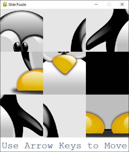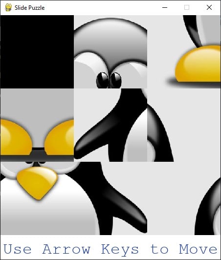 # /* main.py import pygame from frame import Frame pygame.init() pygame.font.init() class Puzzle: def __init__(self, screen): self.screen = screen self.running = True self.FPS = pygame.time.Clock() self.is_arranged = False self.font = pygame.font.SysFont("Courier New", 33) self.background_color = (255, 174, 66) self.message_color = (17, 53, 165) def _draw(self, frame): frame.draw(self.screen) pygame.display.update() def _instruction(self): instructions = self.font.render('Use Arrow Keys to Move', True, self.message_color) screen.blit(instructions,(5,460)) def main(self, frame_size): self.screen.fill("white") frame = Frame(frame_size) self._instruction() while self.running: for event in pygame.event.get(): if event.type == pygame.QUIT: self.running = False self._draw(frame) self.FPS.tick(30) pygame.quit() if __name__ == "__main__": window_size = (450, 500) screen = pygame.display.set_mode(window_size) pygame.display.set_caption("Slide Puzzle") game = Puzzle(screen) game.main(window_size[0]) Let's start coding by importing the necessary modules, such as pygame and the Frame class from a module named frame. It then initializes the Pygame modules and the font module using pygame.init() and pygame.font.init().