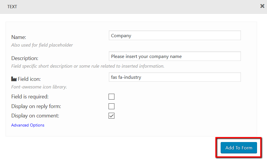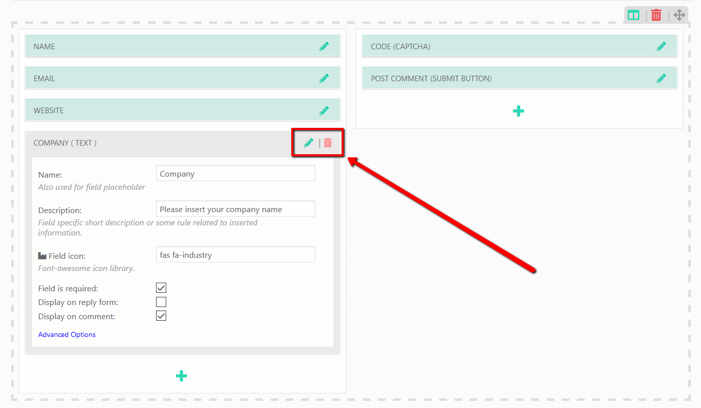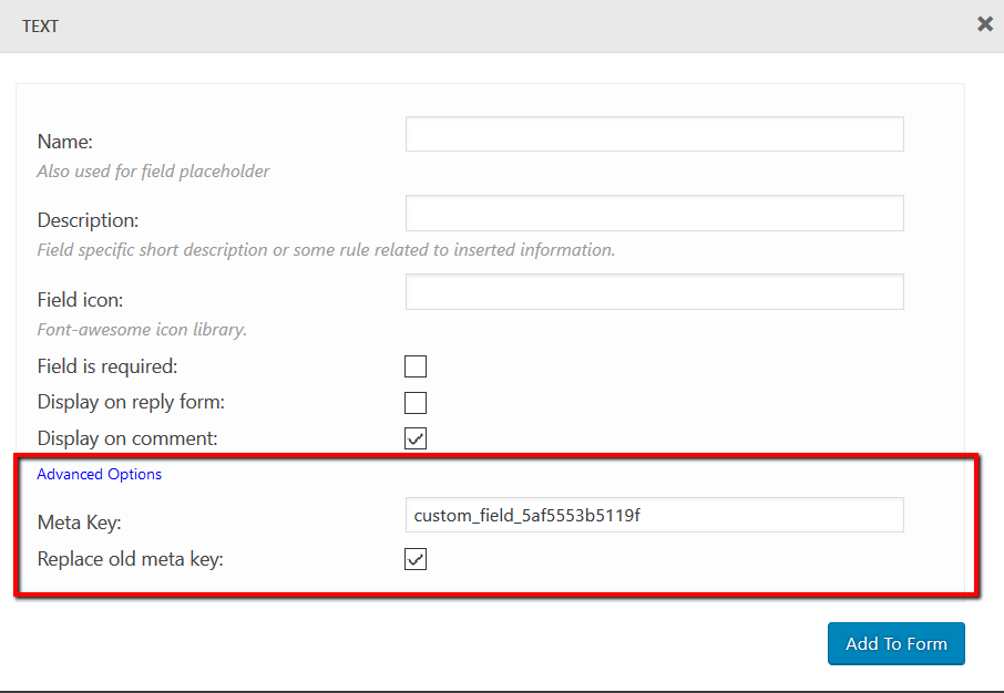 Note: Custom fields “edit” and “delete” actions cannot be undone. All custom fields are stored in database based on custom field meta key set in custom field advanced settings. If you remove a custom field, it’ll also remove field data on website comments (front-end). The only way to reverting those back deleted fields is creating an identical custom field with the same custom field meta key.
