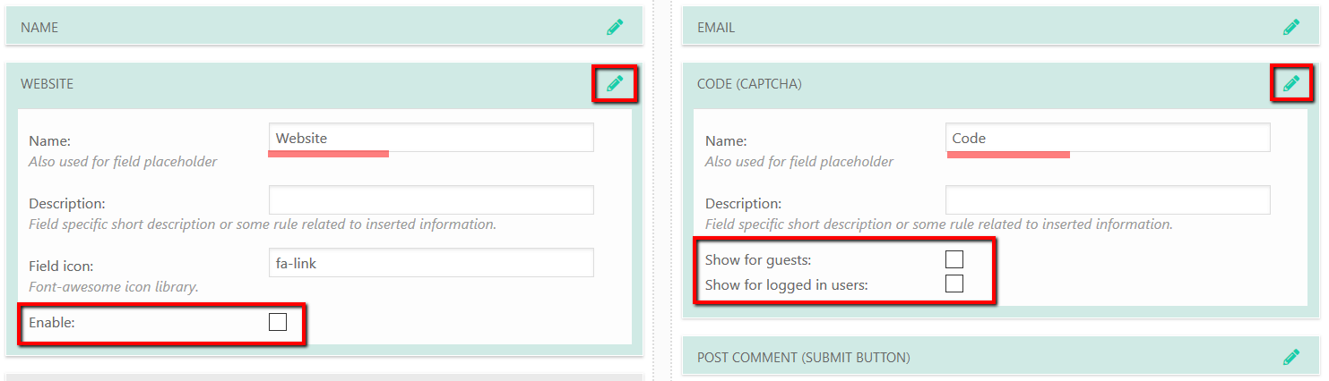 You cannot delete the default fields (name, email, website, reCAPTCHA, submit). The Name and Email fields can be set not-required using the according option. The Website field can be hidden by unchecking the “Enable” option. The reCAPTCHA field can be managed in Dashboard > wpDiscuz > Settings > reCAPTCHA admin page.